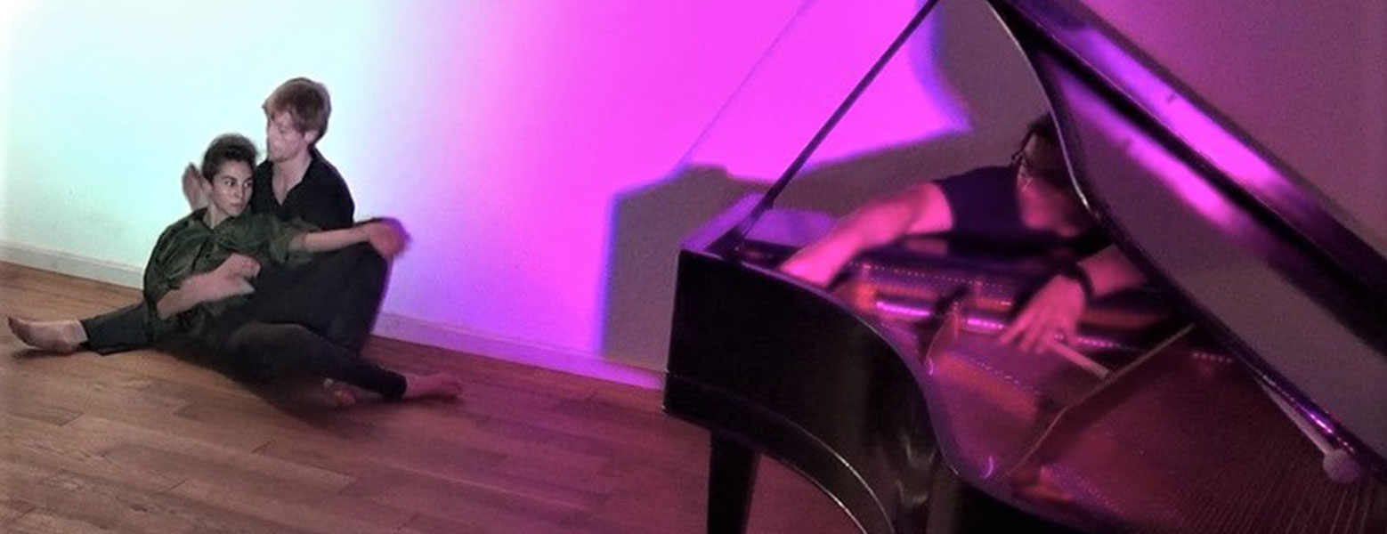 Performance mit zwei Tänzern drei Musikern und umumkehrbaren Wandlungen.