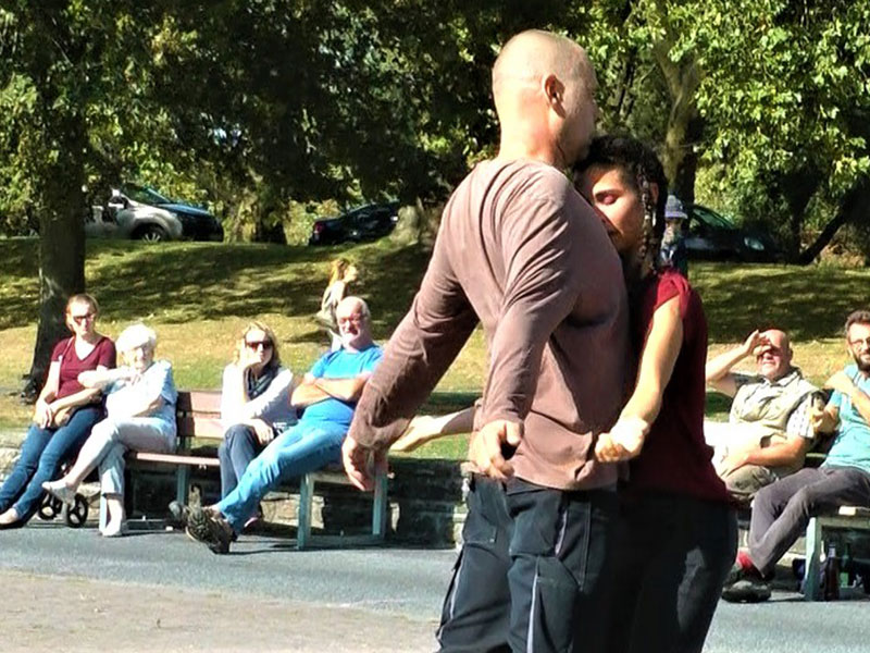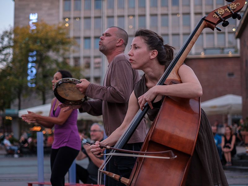Musik- und Tanztheater im öffentlichen Raum für 3 Instrumente, Tanz, an jedem Spielort 2 Gästen
